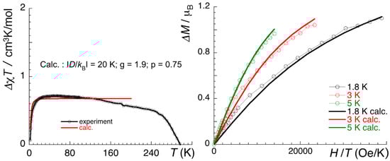 As observed from the temperature dependence of the χT and low-temperature magnetizations in the dark (Figure 3), 1 reveals a paramagnetic behavior with a χT product equal to 0.80 cm3 mol−1 K in agreement with two Cu2+(3d9) ions of S = 1/2 (per Cu2Mo units) with a Zeeman factor of g = 2 (Figure S6) and one diamagnetic Mo4+(4d2 in square antiprism geometry) ion. The superposition of the reduced magnetizations measured at 1.8, 3 and 5 K suggests the absence of magnetic anisotropy. When 1 is irradiated with a light of 405 nm, the value of χT at 10 K increases from 0.79 to 1.4 cm3 mol−1 K after 25 h of irradiation (inset, Figure 3). Then the light is switched off, and low-temperature magnetizations at 1.8, 3 and 5 K were measured. The saturation magnetization at 1.8 K is now 3.09 Nβ, significantly higher than the value of 2 Nβ found before irradiation. The non-superposed reduced magnetizations suggest anisotropy in the photo-induced state. This observation is clearly different in the ground state. The temperature dependence of the χT from 2 K to 300 K first increases to reach a plateau at 1.67 cm3 mol−1 K at 30 K. When compared with the χT product before irradiation, the χT value has increased with a maximum of 0.89 cm3 mol−1 K. Then, the χT product slightly decreases monotonously to reach 1.43 cm3 mol−1 K at 250 K. Above this temperature, a faster decrease of the χT product is observed. At 300 K, the χT value is back to the value obtained before the light irradiation. A new plot χT vs. T (red curve on Figure 3) shows that the photo-induced process is reversible.