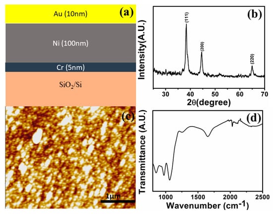 (a) Schematic diagram of Ni/Au thin film (Side view) on the SiO2/Si substrate. (b) XRD pattern, (c) atomic force microscope (AFM) image of bare Ni/Au thin film, and (d) FTIR spectra of ds-DNA monolayer on Ni/Au thin film.