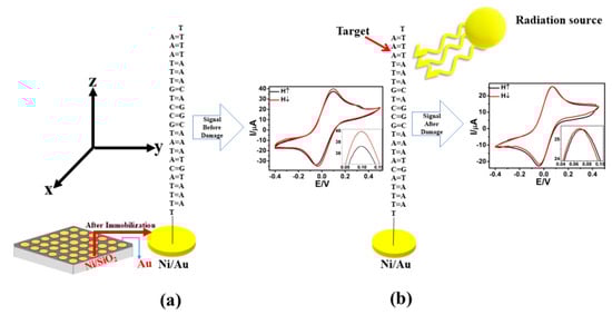 Schematic representation of the working electrode/device: results of the electrochemical measurements of the SAMs of ds-DNA on the Ni/Au (a) before and (b) after the radiation-induced effect in DNA. The electrode is made up of an array of devices consisting of circular patches of Au with a diameter of 2 mm on a continuous Ni thin film. Z-direction represents the spin quantization axis and is normal on the surface of the thin film.