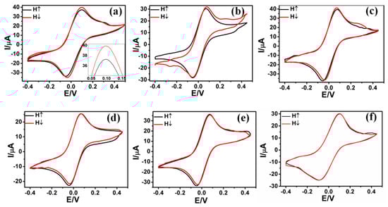 I-V curves of the SAMs of ds-DNA on Ni/Au thin film (batch-1, series-I) with 2 mM K4[Fe (CN)6]. 3H2O/K3[Fe (CN)6] redox couple at pH = 7.2, potassium phosphate buffer and 50 mM KCl base electrolyte, aqueous solution: initial potential = −0.4 V; final potential = +0.45 V; scan rate = 50 mV/s for exposure time t = (a) 0 min (b) 2 min (c) 10 min (d) 20 min and (e) 30 min. (f) I-V curves of a bare Ni/Au thin film from the control experiment. The applied magnetic field in two different directions of the magnetic field (H = 0.5 T) was kept constant for all the samples measured in the present study.