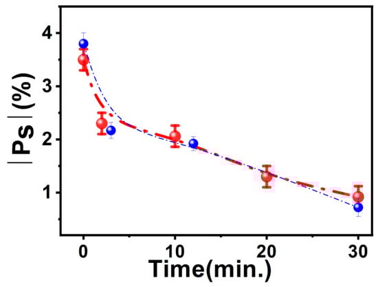 The peak currents for the two different directions of the applied magnetic fields overlap for both the oxidation and reduction processes for bare Ni/Au showing no spin filtering on the part of bare Ni/Au, as expected. But for the SAM-coated Ni/Au sample, we observed a difference in the current values in two directions (up and down) of the magnetic field for both oxidation and reduction processes. When the sample was exposed to γ- radiation, we observed that the difference in the oxidation peak currents for the two directions of the magnetic field decreased gradually, and the symmetric I-V curve (in the forward and reverse scans, Figure 3a) was transformed into a non-symmetric one for samples treated with different radiation doses (Figure 3b,c). Similar non-symmetric behavior in I-V curves has been reported by P.C. Mondal et al. for a chiral-polymer-coated Ni sample [28]. These authors have attributed the presence of a barrier in the conduction of electrons from the surface of Ni to the solution to the observed non-symmetric behavior of I-V curves. However, another study by P.C. Mondal et al. [29] shows a similar non-symmetric I-V curve in L-Cys-TBO-coated Ni/Au thin film. Surface-specific reactions could be one of the reasons for the observed behavior and require thorough investigation, which is beyond the scope of the present study. Note that the oscillatory current recorded for the sample in Figure 3b after the oxidation and reduction potential (>±0.2 V) may be attributed to the unstable interface specific to that particular sample at a higher bias voltage. Nevertheless, the absolute spin polarization value, |PS|, was calculated using Equation (2). Figure 4 represents the |PS| vs. time (dose) curves for two series of samples for different exposure periods.