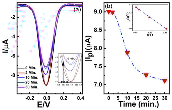 (a) Differential pulse voltammogram (in the reverse scan) of the SAMs of ds-DNA on Ni/Au after t = 0 min, 2 min, 10 min, 20 min and 30 min of γ- radiation, (b) the absolute peak current “|IP|” extracted from (a) is plotted as a function of time. (The experiment was performed with 50 mM KCl and 2 mM K4[Fe (CN)6]/K3[Fe (CN)6] in a phosphate buffer solution at pH = 7.2. The volume of the electrolytes taken was 2 μL. (The dash-dotted line is a B-spline interpolation of the measured data points and is a guide to the eye only). The inset in (b) shows the linear fit of IP0/IP vs. log(t). IP0 (absolute value) represents the peak current at t = 0 min, and IP represents the peak current of samples with a different time span of radiation exposure. Note that the sample area and the volume of electrolyte were kept fixed for all the samples.