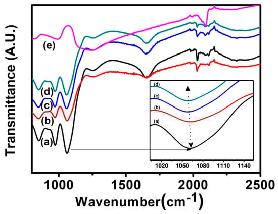 FTIR spectra of the SAMs of ds-DNA for exposure time t = (a) 0 min (b) 2 min (c) 10 min (d) 20 min and (e) 30 min. Inset shows the magnified view of the peak positions of spectra at around 1060 cm−1.