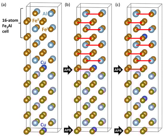 Supercells used in our study. Part (a) shows a 64-atom supercell as an 1 × 1 × 4 multiple of the 16-atom elementary cell of FeAl. Parts (b,c) visualize the studied types of antiphase boundaries (APBs) with Cu atoms located either directly at the APB interfaces (b) or away from them (c), respectively. The subfigures (b,c) include red vectors defining a ⟨100⟩ shift that is characteristic for the studied APBs and applied to the upper halves of the 64-atom supercells.