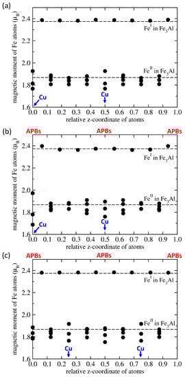 The same trends, i.e., either increased or decreased local magnetic moments of Fe atoms, were found also in the case when the APBs are introduced (see Figure 2b,c). However, the APBs have their own rather complex type of impact on iron atoms close to the APB interfaces. The effect of APBs is better separated from that related to the Cu atoms when the Cu substituents are located away from the APBs (see Figure 2c). The local magnetic moments of Fe atoms in the same {001} plane as the Cu atoms are similar for both Cu substituents in the supercell shown in Figure 1c.