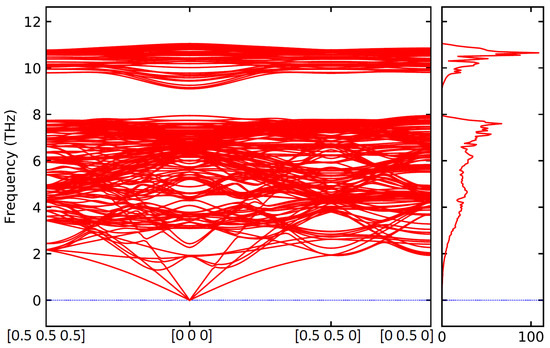 Next, we have determined phonon modes for the supercells visualized in Figure 1. Starting with the APB-free FeAl with Cu substituents, the computed phonon spectra and the overall density of phonon states are shown in Figure 3. The band gap in vibrational frequencies above 8 THz is matching that in perfect FeAl bulk that we reported in our previous study [59]. Interestingly, the point defects represented here by Cu atoms do not close this gap in phonon frequencies in contrast to some APBs that, as we have shown, can close it nearly completely (see [59]). Importantly, the obtained phonon spectrum does not contain any soft phonon modes with imaginary frequencies. Therefore, we assume that the studied system of APB-free FeAl with Cu atoms is mechanically stable.