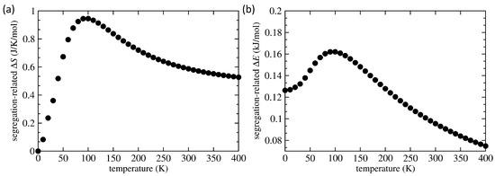 The above-discussed segregation-related energy differences can be linked to the changes in the phonon entropy S and phonon energy E. Their differences between the two supercells containing APBs with differently located Cu atoms are shown in Figure 7. Their trends are nonlinear and nonmonotonous. They increase from their value at T = 0 K up to about T = 95 K and then decrease for higher temperatures. It is worth noting that the studied type of APBs alternates the distribution of atoms at the APB interfaces only slightly when compared to the APB-free lattice. Therefore, interatomic bonds are modified only weakly and the changes in thermal vibrations (and related terms in the free energy) are small. The phonon-related contributions into the segregation-related are nevertheless significant (up to 16–17% discussed above). In contrast, their importance is much smaller (up to 1.5%) in the case the APB-related energy differences (again expressed as the energy difference between 64-atom supercells ), as see Figure 8.