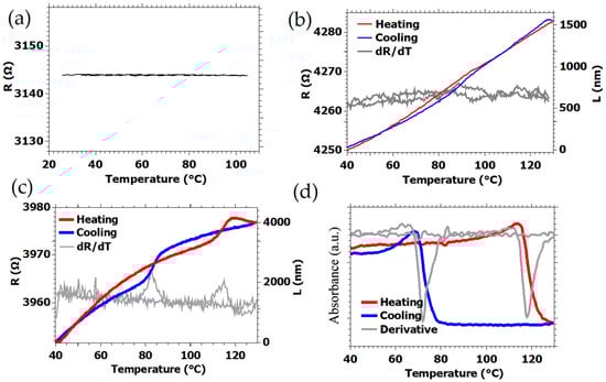 Actuating response upon heating and cooling of (a) an uncoated silicon micro-cantilever, (b) a microcantilever coated with a pure P(VDF-TrFE) film, and (c) a microcantilever coated with a [Fe(Htrz)2(trz)](BF4)@P(VDF-TrFE) composite film. In (b,c) both the measured static piezoresistance change (left axis) and the calculated tip deflection (right axis) are given and the derivative curves (dR/dT vs. T) are also plotted. (d) UV absorbance of a [Fe(Htrz)2(trz)](BF4)@P(VDF-TrFE) composite film recorded at 350 nm both for heating and cooling. The derivative curve (dA/dT vs. T) is also shown.