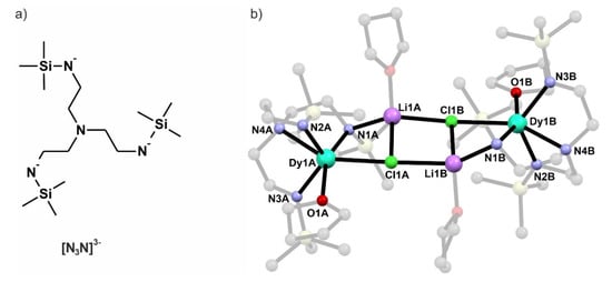 Structural formula of the trianionic tris(N-trimethylsilyl-2-amidoethyl)amine ligand (a) and the crystal structure of {[Dy(N3N)(THF)][LiCl(THF)]}2 (Dy2) (b) with atom labeling scheme (the blocking ligands (N3N)3−, THF molecules and hydrogen atoms are dimmed for the sake of clarity).