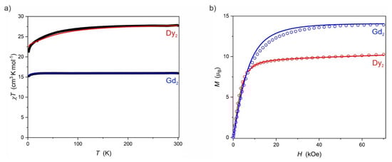 χT(T) recorded at 1000 Oe (a) and M(H) recorded at 2.0 K (b) for Dy2 (red) and Gd2 (blue). Black overlapping points in (a) represent the experimental data and the colored solid lines correspond to the CASSCF ab initio calculations (for details see below) in the case of Dy2 and the best fit (PHI software) in the case of Gd2 with g = 2.00 and JGdGd = −0.004 (1).
