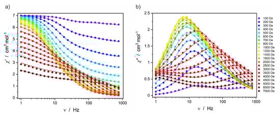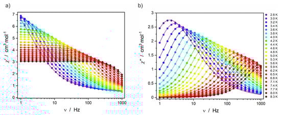 The AC magnetic susceptibility was then studied under the optimal magnetic field of 1000 Oe at various temperatures in the 2.8–8.3 K range (Figure 5). The maxima in the χ″(ν) plots show a clear shift towards higher frequencies when the temperature is increased.