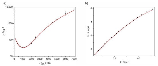 The AC data presented in Figure 4 and Figure 5 were fitted using a modified Debye model [] and the resulting best fits are shown in the respective Figures as colored solid lines. The extracted relaxation times of the magnetization were then plotted vs. the magnetic field τ−1(H) (Figure 6a) and vs. the temperature lnτ(T−1) (Figure 6b). Equation (1) was used to fit the magnetic field dependence of the relaxation times τ extracted from the χ′,χ″(ν) under various magnetic fields []: