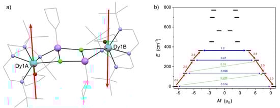 Theoretical calculations CASSCF were performed separately for both DyIII centers based on the SCXRD structural models using the OpenMolcas software [] (for details, see Table S1 in the Supplementary Materials; SM). The ground state Kramers doublet (KD) for both centers is composed mainly of the |±15/2 > mJ state with a significantly axial character (Tables S2 and S3 in the SM) and nearly parallel easy magnetization axes (Figure 7a). The first excited KD doublet is located ca. 130 cm−1 above the ground KD, which is significantly larger than the experimentally estimated energy barrier for the magnetization reversal Ueff = 23.6 cm−1 (Figure 7b) This suggests that the relaxation of the magnetization in Dy2 is controlled by the Raman relaxation mechanism (not Orbach), as already pointed out in the section discussing the AC magnetic data.