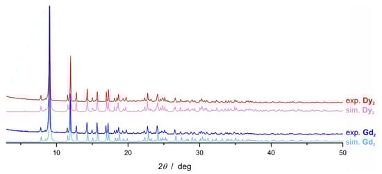 Powder X-ray diffraction patterns: Dy2 experimental at room temperature (red); Dy2 simulated from SCXRD data collected at 296 K (pink); Gd2 experimental at room temperature (blue); Gd2 simulated from SCXRD data collected at 296 K (bright blue).