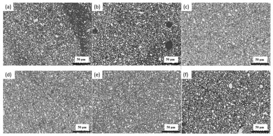 Figure 1a–f displays the optical microscopic images of six LaFe11.71-xMnxSi1.29H1.6 (x = 0.38, 0.39, 0.40, 0.42, 0.43, and 0.44, see Table 1) magnetocaloric powders (labelled P-1 M–P-6 M) that were milled for 30 min. Before imaging, the powders were mounted in epoxy. The milled particles exhibited a similar morphology for all the conditions. Furthermore, the particles were estimated to have diameters well below 50 µm. Figure 2a–f displays the particle size distribution for the milled powders that are listed in Table 1. The particles exhibited a lognormal distribution in which the particle diameters for all powders ranged from ~1 to 15 µm with mean particle sizes that varied between 4.21 to 4.88 µm, indicating that milling for 30 min significantly reduced the particle size (from 800–1250 µm). Table 2 displays the circularity and aspect ratios for the magnetocaloric P-1 M–P-6 M powders that were milled for 30 min. The circularity values were found to range from 0.8137 to 0.8228, while the aspect ratio exhibited values of 0.9401–0.9403. Importantly, these values were within a standard deviation of one another. The similarity between the particle diameter distributions, aspect ratio, and circularity values indicates that the milling process was reproducible. The results also indicate that powder composition had no significant effect on the shape and size of the particles during milling.