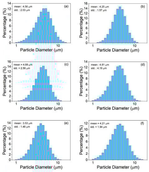 Particle size distribution for milled MCM powders (a) P-1 M, (b) P-2 M, (c) P-3 M, (d) P-4 M, (e) P-5 M, and (f) P-6 M.