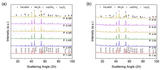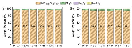 To give a clearer comparison between the phase composition of the different powders, a bar graph for the wt.% of the different phases in the as-received powders P-1 AR–P-6 AR and milled powders P-1 M–P-6 M are plotted in Figure 4a,b. All of the powders contained a similar amount of the LaFeSiH and MnSi phases, which suggests that the milling procedure was reproducible. Finally, the similarity in the phase content of the powders (see Table A1 and Table A2 and Figure 4a,b) indicates that during milling, the powder composition had no significant effect on the phase structure.