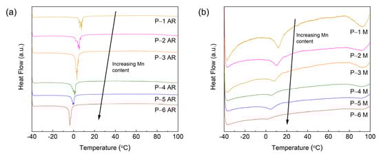 Figure 6a,b presents the differential scanning calorimetry (DSC) curves for the as-received and milled powders for temperatures ranging from −40 to 100 °C. Clear Curie transition peaks were observed for all the samples in the range of −4 to 13 °C. Furthermore, the peaks for the as-received powders (P-1 AR–P-6 AR) are significantly more pronounced as compared to the milled powders P-1 M–P-6 M. Similar to the results for the XRD and magnetic measurement characterization, the peak widths are more broad in the milled powders, which indicates that milling reduced the crystallinity of the powders, which was accompanied by both a decrease in the crystallite size and an increase in the microstrain of the LaFe11.31Si1.69H1.51 and Mn3Si phases (see Table 3). For both sets of patterns, the peaks exhibit a shift towards lower temperatures with an increase in the Mn content, as indicated by the arrow in the graph. For the same Mn content, the Curie temperature increased after milling (see Figure 7), which is consistent with the results obtained from the Temperature dependent magnetization measurements. Lastly, the Curie temperature obtained from the DSC is lower than the temperature dependent magnetization measurement, which is possibly due to the different testing mechanism and the applied magnetic field that increases the ordering temperature.