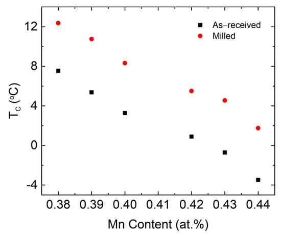 The Tc for both the as-received and milled powders as a function of the Mn content, as determined from the DSC experiments.