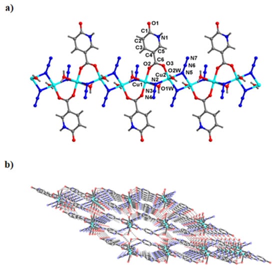 To date, it is still quite difficult to obtain 1D copper(II) coordination polymer molecular magnet due to its small local spin value (SCu = 1/2). Obviously, enlarging the spin ground state through the ferromagnetic interaction is a promising approach to obtaining such a molecular magnet. One strategy involves the rational design of an uneven copper(II) chain, in which several copper(II) atoms are linked to each other by mixed bridges to form polynuclear copper(II) subunit, yielding a larger spin ground state through the ferromagnetic interaction, then the subunits are carefully assembled together. To achieve such a design, a reasonable choice of bridging ligands is of ultimate importance, because they can determine the strength and type of the magnetic coupling. Furthermore, a suitable complementary organic ligand is also necessary to handpick. The azido in the end-on (EO) coordination mode is an ideal inorganic bridge to connect with two neighboring metal (M) cations. The reason is that the M-N-M bond angle is less than 108° [19,20,21,22,23,24,25,26,27,28,29,30,31,32], or this angle is greater than 108° but the EO- azido bridge works synchronously with the syn-syn carboxylato bridge [33,34,35,36], in both cases it can mediate ferromagnetic coupling; while 6-hydroxynicotinate (Scheme 1) was utilized as the organic bridge: the proton in its hydroxyl group can be automatically transferred to the nitrogen atom of the pyridine ring (that is, autoisomerization), which avoids the latter taking part in the coordination role to form high dimensional networks, as those pyridine rings in nicotinate and isonicotinate do [37,38], furthermore, the dehydrogenated hydroxyl group can generate interchain hydrogen-bonds, mediating the interchain magnetic interactions. As a result of our attempts, such an uneven chain-like copper(II) complex, (Cu3(L)2(N3)4(H2O)3)n (HL = 6-hydroxynicotinic acid) (1) was obtained by self-assembly process. To the best of our knowledge, this is the first 1D chain azido-bridged copper(II) coordination polymer showing not only metamagnetic behavior but also long-range magnetic ordering.