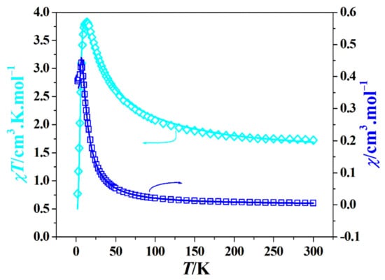 We attempted to simulate the magnetic data of 1 with rigorous models existing for the S = 1/2 trimeric chain [41] or the alternating chain J-J-J′ in the classical limit [42]. However, no reasonable fitting results could be obtained. So, an approximate model method was utilized [43,44,45,46,47], where 1 is treated as a uniform chain with linear trinuclear {Cu3} as a subunit, for which Ĥ = −2J (ŜCu1ŜCu2 + ŜCu1ŜCu3) (for {Cu3}) [48] and Ĥ = −2Jc∑ŜT,iŜT,i+1 (ŜT for {Cu3} as a classical system [49]). The exchange parameter J reflects the exchange between two Cu(II) ions within the trinuclear {Cu3} unit, Jc stands for the interunit magnetic interaction. Moreover, the interchain interaction was estimated by the mean field model, in which zJ′ is used to calculate the inter-chain magnetic interaction. The following Equations (1)–(5) are derived from the above Hamiltonians and models.