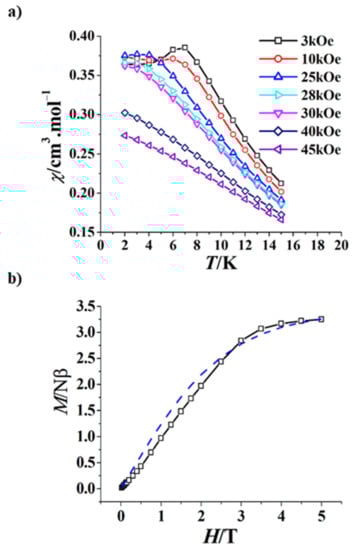 Interestingly, weak magnet behavior was observed at temperatures below 6.7 K. The divergence of the zero-field cooled (ZFC) and the field cooled (FC) susceptibilities below about 6.7 K indicates the irreversible behavior of long-range magnetic ordering (Figure 4a). A very small remnant magnetization (0.001 Nβ) and a small coercive field (18 Oe) can be detected at 2.0 K (Figure 4b and Figure S3), suggesting that such a molecular magnet is weak and soft. Ac susceptibility measurements showed that χ′ (T) are frequency-independent, which have a weak peak at 6.7 K for frequencies of 10–499 Hz, confirming that the long-range magnetic ordering appears at 6.7 K (Figure 5), that is, Tc = 6.7 K for 1. However, χ″ is negligibly small for all corresponding frequencies, notably, the absence of χ″ in ac susceptibility at zero dc field has also been observed in other chain-like compounds exhibiting both metamagnetic behavior and magnetic ordering, [15,51,52] owing to the interchain antiferromagnetic interaction. When the temperature (7.0 K) is greater than 6.7 K, the S shape in the M-H curve observed at 2.0 K disappears (Figure S4). As a comparison, although another 1D uneven chain-like compound (Cu1.5(L)(N3)2(μ2–H2O))n also exhibits ferromagnetic exchange [39], it seems to possess magnetic ordering behavior only at below 2.0 K. As we all know, in the absence of interchain interactions, the 1D magnetic system cannot create long-range magnetic ordering when T > 0 K [1,53,54], obviously, the interchain hydrogen bonds in 1 play a critical role in exhibiting long-range magnetic ordering through forming a 3D supramolecular array [18], though the interchain antiferromagnetic interaction may induce the metamagnetic behavior.
