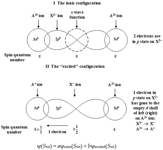 As a result, if ψionic(Stot) and ψexcited(Stot) are the respective wave functions of the starting ionic configuration and the excited one, the final state of the entity A–X–A is described via the global wave function ψ(Stot) = aψionic(Stot) + bψexcited(Stot), where a and b are small.