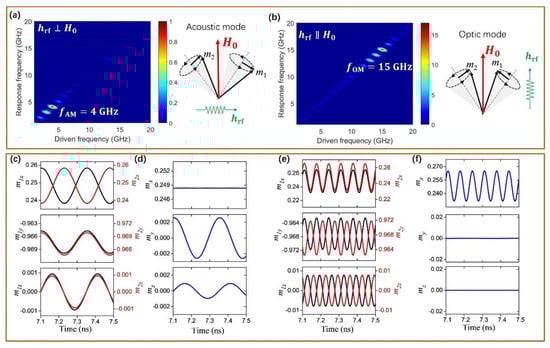 It is well known that an SAF system inherently has two distinct eigenmodes: AM and OM [,]. Figure 2 summarizes the simulated results at H0 = 600 Oe for a symmetrical SAF with two identical FM layers (d1 = d2 = 2.0 nm). In the case of transverse pumping, only AM resonance is excited at a low frequency of 4 GHz while for the longitudinal pumping case only OM resonance is excited at a high frequency of 15 GHz, as shown in Figure 2a,b, respectively. This result can be well explained as follows: by considering that the resonance response signal is characterized by the rf components of the net magnetization along the pumping field direction. For the low frequency resonance state, as shown in Figure 2c, d, both y- and z-components of and precess in phase while the x-component oscillates out-of-phase. In contrast, for the high frequency resonance state, as shown in Figure 2e,f, the x-component of and precess in-phase while both y- and z-components precess out-of-phase. Therefore, for the AFMR measurement with a transverse pumping microwave field (along the y-axis) to the bias magnetic field (x-axis), the in-phase AM resonance state (taken from the my or mz) is only observed while the OM resonance state is hidden. In contrast, for the longitudinal pumping microwave field (along the x-axis), the observed resonance signal comes from the net magnetization mx (because the net my = 0 or mz = 0) but we classify this resonance state as the OM state due to the out-of-phase in my (or mz) component.