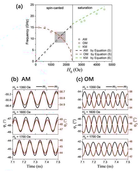 Figure 3a shows the dispersion relation of frequency versus external magnetic field H0 applied in the x-direction. In the spin-canted region, the frequency of the in-phase AM fAM increases with the increasing field while the out-of-phase OM frequency fOM decreases gradually until it reaches zero at the critical filed Oe. Theoretically, we could assume the whole FM layer is a single-domain and possesses a uniform magnetization precession within each layer. Thus, within the macrospin approximation, Equation (1) can be expanded as: