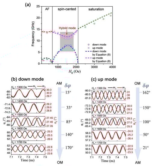 To acquire a clearer insight into the behavior of magnon-magnon coupling, we further studied the phase difference of magnetization evolution between and , as shown in Figure 4b,c. The down mode and up mode have obvious changes with the external magnetic field. As the external magnetic field H0 increases, the down mode changes from pure AM to OM, while the up mode changes from pure OM to AM. Remarkably, the phase difference of the new hybrid mode is not 0or 180but almost 90 at the strongest coupling field (H0 = 1500 Oe). Actually, this process of change can also establish the relationship between the phase difference and the magnon coupling strength.