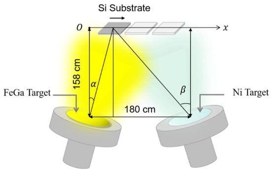 FeGa and FeGaNi films were grown on 25 × 25 mm2 silicon (111) substrates by using DC magnetron sputtering (Kurt J. Lesker) with different oblique sputtering angles. The composition of the target was fixed at Fe80Ga20 (at%), and all the targets had a diameter of 2.0 inches. The base pressure for deposition is less than 1 × 10−7 Torr and the films were deposited in a 5 mTorr Ar atmosphere. The sputtering power was set to 48 W for FeGa target and 10 W for the Ni target. The schematic diagram of the sputtering process is shown in Figure 1. The center distance of the FeGa and Ni targets is approximately 180 cm. The Si substrate is placed in a line which is approximately158 cm above the center connection of the FeGa and Ni targets. α and β are the oblique angles of the FeGa and Ni targets with the substrate, respectively. In order to obtain a different oblique sputtering angle, the substrate was placed in such a position in order of 30, 60, 90, 120, and 160 cm along the x axis, and the corresponding angles α and β are shown in Table 1. It can be found that the variation of angles α and β show opposite tendencies over position x. Thus, herein, we only need to consider the case of the variation of angle α. Then, we fabricated FeGa films with the FeGa target and prepared FeGaNi films with the FeGa and Ni targets. The sputtering rates of the FeGa and Ni targets vary with different x positions through the surface profile meter. By controlling the sputtering switch and sputtering time, a series of FeGa and FeGaNi films with a thickness of approximately 85 nm was obtained.