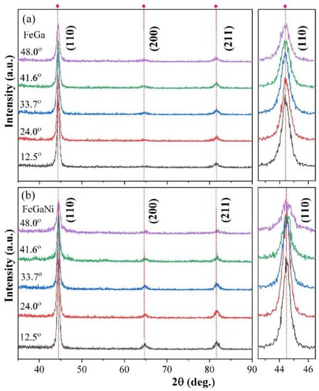 The structural characterization of the FeGa and FeGaNi films were investigated by using XRD. The oblique sputtering angle α dependent XRD spectra for FeGa and FeGaNi films are shown in Figure 2a,b, respectively. It can be clearly seen that all the films display a strong diffraction peak at 44.6° corresponding to the bcc (110) diffraction peak and two weak peaks at 65° and 82° corresponding to the bcc (200) and (211) diffraction peaks for FeGa or FeGaNi films, illustrating a common polycrystalline structure. The strength of the peaks indicates that the growth direction is a slight preferred orientation along (110) [9,32,33]. The position and shape of the peaks have no clear change. The strength of the peaks decreases with the increase in the α angle. This is because the distance between substrate and targets changes with the angles which is an important reason to change the quality of the film. Meanwhile, in the same oblique sputtering angle, the strength of the peaks of FeGaNi is stronger than that of FeGa. For the Ni film, a strong peak of (111) is at approximately 44.6° and a weak peak (200) is at approximately 52° [34,35]. However, from Figure 2b, there is no peak at approximately 52°. This may be because that the low content of Ni causes the (200) peak not to appear in FeGaNi films. Thus, it is difficult to distinguish FeGa and Ni from the XRD patterns.