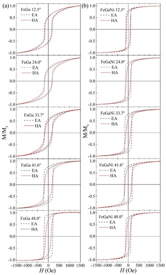 The typical hysteresis loops of FeGa and FeGaNi films corresponding to the increase in α angle are shown in Figure 4. The loops of FeGa films along the easy and hard axis are almost the same when the α angle is less than 24°. However, the magnetic anisotropy becomes obvious with the increase in the α angle. This indicates that in-plane anisotropy can be induced by oblique sputtering for the internal stress in FeGa films [9,31]. Meanwhile, in Figure 4b, FeGaNi films show narrower hysteresis loops and relatively stronger in-plane magnetic anisotropy compared with FeGa, which means that doping Ni can improve the soft magnetic property of FeGa films. However, the in-plane magnetic anisotropy increases when angle α is less than 33.7° and then decreases as angle α increases. This may be explained by the collisions between FeGa and Ni atoms in the sputtering process. From Figure 1, the distance between the substrate and Ni target decreases with the increase in angle α, so the effect of collisions between FeGa and Ni atoms would increase. Meanwhile, with the low sputtering power of Ni target, the distance between the substrate and Ni target is relatively large when the α angle is less 33.7°, and the effect of collisions between the FeGa and Ni atoms is not obvious in the formation of in-plane magnetic anisotropy. However, as the α angle continues to increase, the distance between the substrate and Ni target reduces, the effect of collisions between FeGa and Ni atoms becomes obvious. Then, the in-plane magnetic anisotropy decreases.