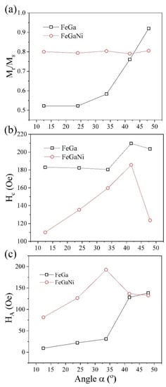 From Figure 5a, the remanence ratio (Mr/Ms) of FeGa films gradually increases from 0.5 to 0.92 with the increase in angle α. The enhanced Mr/Ms by oblique sputtering is very obvious [9], while the Mr/Ms of FeGaNi films remains at approximately 0.8 with the increase in angle α. This indicates that the Mr/Ms of FeGa films can be improved by doping Ni when angle α is less than 41.6°. In Figure 5b, the coercivity of the easy axis (Hc) of FeGa films decreases from 183 to 180.5 Oe when angle α is less than 33.7° and then increases to 208 Oe when angle α is 41.6° and 204 Oe when angle α is 48°. The change I the coercivity of FeGa films could be understood by the change of crystallite size. When the crystallite size is larger than the exchange length, the coercivity would increase with the decrease in crystallite size for soft magnetic materials [36,37]. The exchange length of FeGa is 5.7 nm [36,37], which is smaller than the crystallite size of FeGa from Figure 3. The crystallite size of FeGa gradually decreases with the increase in angle α from Figure 3. When angle α is less than 33.7°, the crystallite size of FeGa shows small change. The coercivity of FeGa films also expresses very little change. As angle α continues to increase, the coercivity of FeGa increases and the crystallite size decreases, which is similar to what was expected. Comparing the coercivity of the FeGaNi and FeGa films in Figure 5b, the coercivity of FeGaNi films is smaller than that of FeGa films, which indicates that the doping is an effective means of improving the soft magnetic property. However, the Hc of FeGaNi films first increases from 110 to 180 Oe, when angle α increases from 12.5° to 41.6° and then decreases to 120 Oe when angle α is 48°. From Figure 3, the crystallite size of FeGaNi decreases with the increase in angle α. Thus, the coercivity of FeGaNi films should increase with the increase in angle α. However, as angle α increases, the content of Ni also increases, as can be seen in Table 2. The soft magnetic phase FeNi may be formed in FeGaNi films. As a result, there is a competitive relationship between the effect of crystallite size and Ni doping on the coercivity of FeGaNi films. So, when angle α is less than 33.7°, the crystallite size effect takes the main responsibility for the increase in Hc. With the increase in angle α, the effect of Ni doping becomes competitive, which could lead to the decrease in coercivity when angle α is 48°.