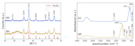 XRD results for uncoated iron oxide, NP-FeO and the silica-coated iron oxide nanoparticles (NP-FeO/SiO) are shown in Figure 1a,b. The standard XRD pattern for microscopic magnetite (JCPDS 88-0315) is also shown in Figure 1. As seen, the obtained results are in close agreement with the standard XRD pattern and indicate the formation of an inverse cubic spinel structure. The appearance of well-defined Bragg’s peaks indicates that nanoparticles with a high degree of crystallinity were successfully synthesized [51]. In Figure 1b, besides the characteristic peaks of iron oxide, a broadened halo centered at 2θ~23 is observed and is related to the characteristic thin silica shell (JCPDS 82-1554) that coats the iron oxide nanoparticles [52]. The mean crystallite sizes for both samples, NP-FeO and NP-FeO/SiO, were determined from line-broadening of the most intense diffraction peak ((311) at (2θ~35.5)) by using the Scherrer’s equation [53]. The estimated crystallite sizes are 10.3 ± 0.8 nm and 8.3 ± 0.6 nm for NP-FeO and NP-FeO/SiO, respectively. It is important to highlight that NP-FeO presents a black color, which is one more indication of the predominance of a magnetite structure instead a maghemite structure (red color).