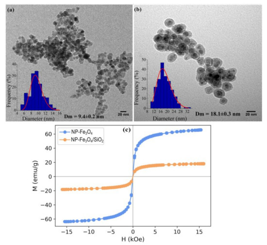 Magnetic hysteresis curves for NP-FeO and NP-FeO/SiO nanoparticles are shown in Figure 2c. As can be seen, the saturation magnetization (M) obtained for the synthesized magnetite is lower than that of multidomain bulk magnetite (~90 emu/g) [58]. Remarkably, different particle sizes, surface areas, crystal defects and chemical compositions can properly explain possible deviations in the saturation magnetization. In fact, M values reached 63.8 and 18.2 emu/g, respectively, for NP-FeO and NP-FeO/SiO samples. The literature provides saturation magnetization values for similar SiO-coated magnetite nanoparticles close to the ones measured in this study [52,59]. The insert in Figure 2c shows an enlarged view of low field of hysteresis curves for both samples. As can be seen, the analyzed nanoparticles present coercivity close to zero and have high remanence, indicating superparamagnetic behavior at room temperature. In most cases, an inorganic layer on the surface of nanoparticles can undoubtedly contribute to an apparent decrease in M values since the magnetic signal is proportional to the mass in standard VSM tests [60]. M values can properly be corrected by considering only the mass of the magnetic core. The mass of each component of the core/shell structure can be estimated by taking into account the density of the materials. In the case of the SiO shell, a density of 1.87 g/cm is assumed [61,62], with 5.10 g/cm for the magnetic core (magnetite) [63]. Using the mean diameter obtained by TEM images for the core/shell nanoparticles (NP-FeO/SiO), the contribution of each component for Ms is estimated as 78.6% for the silica shell and 21.4% for the magnetite core. Therefore, the M can be properly corrected and reaches 85.07 emu/g, i.e., increasing by ~33.2% in comparison with NP-FeOnanoparticles. In fact, NP-FeO can typically undergo an oxidative process, and thus, their outer layer (surface) can invariably lose its magnetic properties. However, in NP-FeO/SiO2 samples, the SiOon the particles’ surface acts as a protective layer, preventing oxidation.