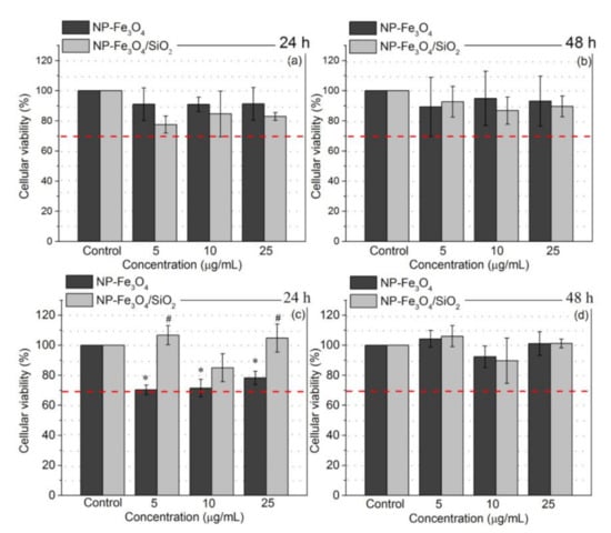 Cell viability assays for MCF-7 cells treated with NP- FeO and NP-FeO/SiO at different NP concentrations (5 to 25 g/mL) for (a) 24 h and (b) 48 h. Control group: untreated MCF-7 cells. Cell viability assays for HaCaT cells treated with NP- FeO and NP-FeO/SiO at different NP concentrations (5 to 25 g/mL) for (c) 24 and (d) 48 h. Data are expressed as percentage of control. * Statistically significant difference in relation to control (p < 0.05); # Statistically different in relation to 5 g/mL NP-FeO and statistically different compared to 25 g/mL NP-FeO (p < 0.05). Red dashed line threshold shows the limit percentage of cell viability (70%, ISO 10993-5).