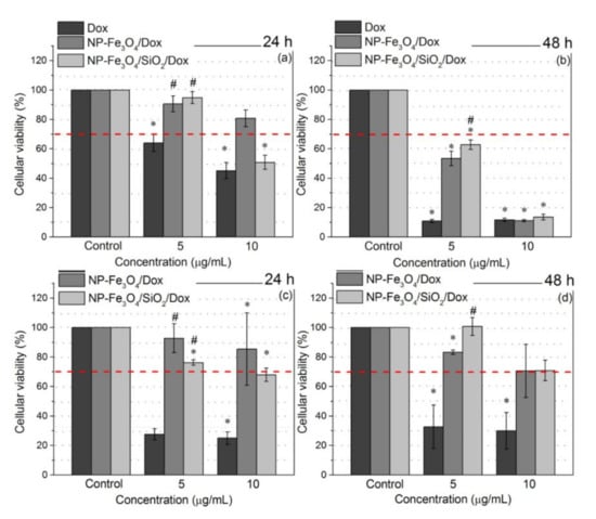 Cell viability assay for MCF-7 cells treated with Dox, NP-FeO/Dox and NP-FeO/SiO/Dox at concentrations of 5 and 10 g/mL for (a) 24 h and (b) 48 h. Control group: untreated MCF-7 cells. Cell viability assays for HaCat cells treated with Dox, NP-FeO/Dox and NP-FeO/SiO/Dox at concentrations of 5 and 10 g/mL for (c) 24 h and (d) 48 h. Control group: untreated HaCat cells. Data are expressed as percentage of control group. * p < 0.05, significantly different compared to control; # p < 0.05, significantly different compared to 5 g/mL doxorubicin; p < 0.05, significantly different compared to 10 g/mL doxorubicin. Red dashed line threshold shows the limit percentage of cell viability (70%, ISO 10993-5).