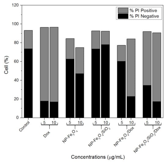 In this analysis, propidium iodide (PI) was used as a probe that binds to DNA in cells with a non-intact membrane, allowing identification of cell membrane integrity. For the assay, MCF-7 cells were grown in six-well culture plates at a density of 5 × 10 cells/mL. The cells were exposed for 24h to different NP groups (NP-FeO, NP-FeO/SiO, NP-FeO-/Dox and NP-FeO/SiO/Dox), as well as Dox free, at two concentrations: 5 and 10 g/mL. Untreated cells were used as control. Then, the cells were harvested, centrifuged and re-suspended in phosphate-buffered saline (PBS) and incubated with 5 L of PI for 10 min, and the integrity of the cell membrane was checked. Data acquisition and analysis were performed using a FACSCalibur flow cytometer equipped with CellQuest software. A total of 5000 events were acquired.