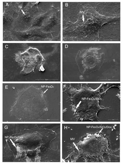 Scanning electron microscopy images of MCF-7 cells that stayed in contact with different analyzed systems for 24 h. (A,B) Control, bar: 15 m, 10 m, respectively; (C,D) Dox 10 g/mL, bar: 25 m, 15 m, respectively; (E) NP-FeO10 g/mL, bar: 15 m; (F) NP-FeO/SiO 10 g/mL, bar: 10 m; (G) NP-FeO/Dox 10 g/mL, bar: 10 m; and (H) NP-FeO/SiO/Dox 10 g/mL, bar: 10 m; MV, microvilli; Nu, nucleolus.