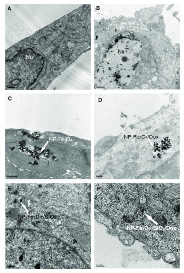 TEM images of MCF-7 cells that stayed in contact for 24 h with different systems at a concentration of 10 g/mL: (A) control (cells alone); (B) Dox; (C) NP-FeO; (D) NP-FeO/Dox, bar: 10 m; (E) NP-FeO/SiO; and (F) NP-FeO/SiO/Dox; Nu, nucleus.