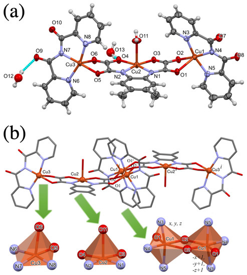 Compound 1 crystallizes in the triclinic space group with the asymmetric unit composed of a neutral oxamato-bridged trinuclear copper(II) unit, {[Cubpca)]2[Cu(dmopba)(H2O)]}, where the [Cu(dmopba)]2− anion is coordinated to two {[Cubpca)]+ cations through the oxamato groups together with two water molecules of crystallization (Figure 1a). Two tricopper(II) units are additionally coordinated through the carbonyl oxygen atoms (O2 and O2i; symmetry code: (i) = −x + 1, −y + 1, −z + 1) of the carboxylate portion of one oxamate bridging group, resulting in an overall centrosymmetric linear hexanuclear copper(II) entity with a dimer-of-trinuclear topology (Figure 1b). The coordination polyhedra of the copper atoms in 1 are also depicted in Figure 1b highlighting different geometries: Cu2 and Cu3 exhibit a square pyramidal geometry, whereas Cu1 adopts a distorted octahedral geometry within an edge-sharing octahedral motif environment. The geometry of the three copper(II) ions was also verified through SHAPE measurements software (Table S4) [53]. According to these results, the pentacoordinate Cu2 and Cu3 atoms present a spherical square pyramid (SPY-5) and vacant octahedral symmetry (v-OC), respectively, while the hexacoordinate Cu3 atom exhibits a distorted octahedral (OC) symmetry.