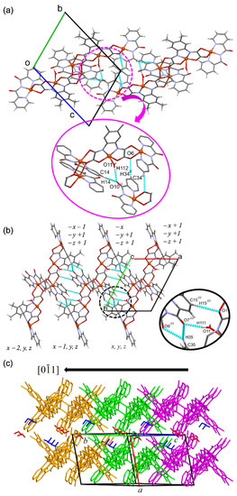 In the crystal lattice, the adjacent centrosymmetrically related hexanuclear entities are connected via classical and non-classical H-bonds forming infinite chains along the [011] direction (Figure 3a). The oxygen atom (O11) from the coordinate water molecule of the [Cu(dmopba)]2− unit works as an H bond donor to one of the carboxylate oxygen atoms (O10) of the [Cu(bpca)]+ unit [O11–H112···O10ii; symmetry code: (ii) = −x + 1, −y + 2, −z + 2]. The non-classical H bonds involve two aromatic carbons atoms from both bpca ligands [C14–H14···O10ii and C34ii–H34ii···O6]. The chains are themselves connected through H bonds along the [100] direction (Figure 3b), being stabilized by one classical H bond involving the coordinate water molecule atom [O11–H111·O7iii; symmetry code: (iii) = −x, −y + 1, −z + 1] and three non-classical H bonds involving the aromatic carbons from the bpca ligands, C15iii–H15iii·O1, C35–H35···O8iii, and C35–H35···O7iii. The resulting 2D H bond network is stacked along the [01] direction (Figure 3c). The H bond geometries are given in Table S3 (Supplementary Materials).
