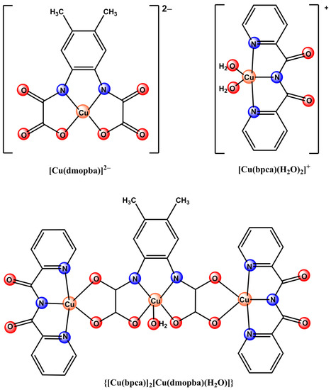 - Simões, T.R.G.; Mambrini, R.V.; Reis, D.O.; Marinho, M.V.; Ribeiro, M.A.; Pinheiro, C.B.; Ferrando-Soria, J.; Déniz, M.; Ruiz-Pérez, C.; Cangussu, D.; et al. Copper(II) Assembling with Bis(2-Pyridylcarbonyl)Amidate and N,N′-2,2-Phenylenebis(Oxamate). Dalton Trans. 2013, 42, 5778–5795. [Google Scholar] [CrossRef]