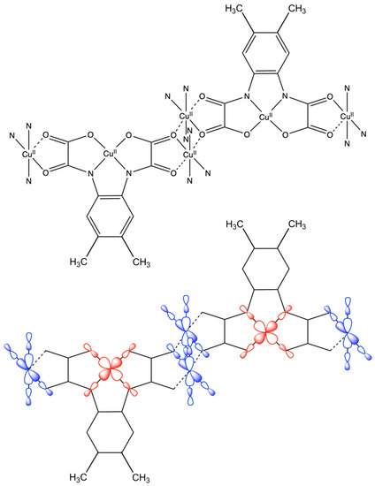 Finally, to describe the weak ferromagnetic interaction between the two trinuclear moieties in 1, we need to consider the hexanuclear structure once there is an orbital pathway between Cu1 and Cu1i atoms from two [Cu(bpca)]+ cations through the carbonyl carboxylate oxygen atoms of the oxamate bridge, as illustrated in Scheme 3. Focusing on the Cu2O2 bridging core, 1 could exhibit intertrinuclear ferromagnetic or antiferromagnetic couplings. The main structural feature that contributes to the determination of the kind of magnetic coupling is the Cu–O–Cu angle, which is related to the combination of the dx2–y2 magnetic orbitals of the copper(II) ions with the symmetry-adapted molecular orbitals of the oxamate bridge [39,59]. As reported elsewhere [59], an antiferromagnetic character is found for dicopper(II) compounds with an out-of-plane parallel planar disposition in which this angle is more significant than 95.34°. Likewise, ferromagnetic behavior appeared in compounds in which this value is higher than 101.9°. In 1, the Cu–O–Cu angle is 105.63(8)° (Figure 2a), supporting the ferromagnetic behavior (J′ = +1.39 cm−1). This value agrees with some results reported for distorted octahedral carboxylate bridged Cu2O2 units described in the literature [59,60,61,62,63].