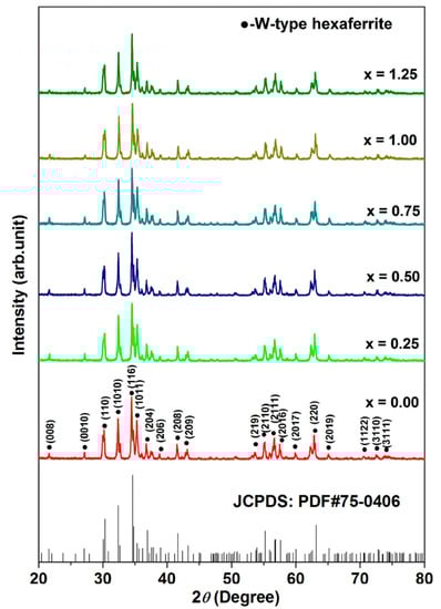 Figure 1 shows the XRD patterns of the W-type SrYb hexaferrite Sr0.85Yb0.15Zn1.5Co0.5AlxFe16−xO27 (0.00 ≤ x ≤ 1.25). As shown in Figure 1, the XRD patterns confirmed that all the samples had a single-phased W-type hexaferrite structure, and the peaks of all the samples matched well with the standard JCPDS card (no. 75-0406); no impurity or undesirable phase was observed for any sample. This means that Al substitution does not change the magnetoplumbite structure of W-type SrYb hexaferrites.