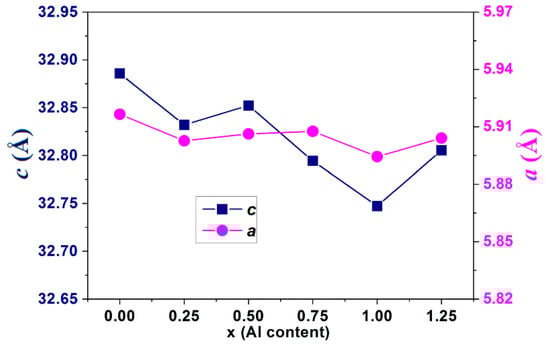 where dhkl is the inner planner spacing of the XRD pattern, and h, k, and l are Miller exponents. The lattice constants (c and a) for the W-type SrYb hexaferrite Sr0.85Yb0.15Zn1.5Co0.5AlxFe16−xO27 (0.00 ≤ x ≤ 1.25) are depicted in Figure 2. It can be clearly seen from the graph that the values of c and a of W-type SrYb hexagonal ferrites with Al substitution (0.25 ≤ Al content (x) ≤ 1.25) are smaller than that of W-type SrYb hexagonal ferrites without Al substitution. The decrease in lattice parameters c and a for the Al-substituted W-type SrYb hexaferrites (0.25 ≤ x ≤ 1.25) is because the ionic radius of Al3+ (0.535 Å) is smaller than that of Fe3+ (0.645 Å) [,,]. However, as the Al content (x) increased from 0.25 to 1.25, the lattice parameters c and a of the Al-substituted W-type SrYb hexagonal ferrites fluctuated within a certain range.
