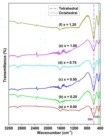 The FT-IR spectra of the W-type SrYb hexaferrite Sr0.85Yb0.15Zn1.5Co0.5AlxFe16−xO27 (0.00 ≤ x ≤ 1.25) are exhibited in Figure 3. Fourier transform infrared spectroscopy is a useful method for representing and recognizing chemical bonds, detecting functional groups, and detecting phase transitions at the tetrahedral and octahedral positions. The absorption bands in the frequency range of 400–800 cm−1 correspond to stretching vibration at tetrahedral and octahedral positions in ferrite structures []. The absorption band at about 451 cm−1 is attributed to the stretching vibration of octahedral metal ions and oxygen bonds, and the absorption band at about 594 cm−1 is attributed to the stretching vibration of tetrahedral metal ions and oxygen bonds []. The absorption bands at the tetrahedral and octahedral sites showed an intrinsic deviation in behavior, and this may be due to the Al3+ (0.535 Å) ion substitution for the Fe3+ (0.645 Å) ions. It is obvious from the diagram that the normal vibrational modes of the tetrahedral clusters were higher than those of the octahedral clusters. This is mainly because the bond length of tetrahedral clusters is shorter than that of octahedral clusters []. The absorption band at about 673 cm−1 in the spectrum of W-type SrYb hexaferrites with the Al content (x) = 0 could be due to the metal–oxygen stretching vibrations of α-Fe2O3 []. The absorption band at about 1500 cm−1 in the spectrum of W-type SrYb hexaferrites with the Al contents (x) = 0.5 and 1.0 may be caused by some trace impurities that entered the samples during the mixing of W-type SrYb hexaferrite powder with potassium bromide powder and the subsequent pressing of a very thin pancake sample. The spectra of W-type SrYb hexaferrites with different Al contents (x) indicate that the characteristic absorption bands at about 2921 cm−1 and about 1628 cm−1 are attributed to the presence of the O-H stretching bond because of the moisture content of W-type SrYb hexaferrites during their preparation process [].