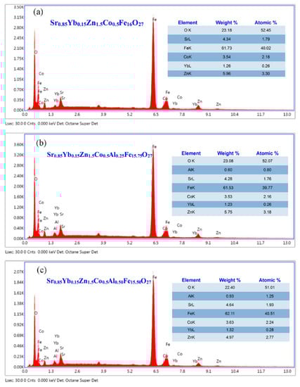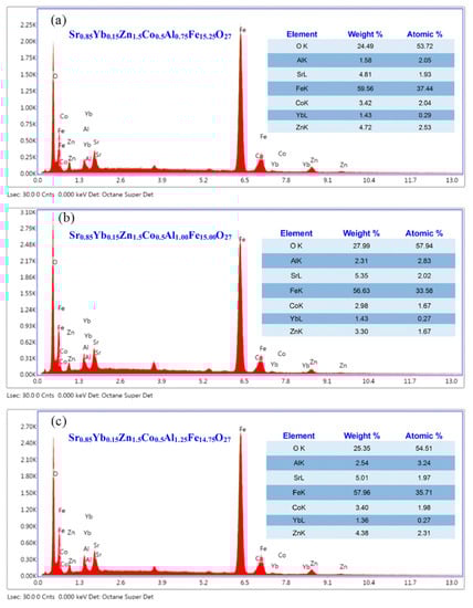 Figure 5 and Figure 6 illustrate the EDX spectra and elemental mapping images of the W-type SrYb hexaferrite Sr0.85Yb0.15Zn1.5Co0.5AlxFe16−xO27 with the Al content (x) ranging from x = 0.00 to x = 0.50, and the Al content (x) ranging from x = 0.75 to x = 1.25, respectively. As shown in Figure 5 and Figure 6, the suitability of replacing Al for Fe in W-type SrYb hexaferrites is confirmed. The EDX spectra in Figure 5 and Figure 6 for W-type SrYb hexaferrites with different Al contents (x) reveal the presence of Sr, Yb, Zn, Co, Al, Fe, and O, and their contents, which are in close agreement with the nominal elemental compositions. The inset of each figure exhibits the molecular and atomic weight of the element that was used in the preparation process. The increase in Al content and decrease in the host elements mean that the materials keep their stoichiometric contents. This confirms that Al ions replace Fe ions in the W-type SrYb hexaferrites.