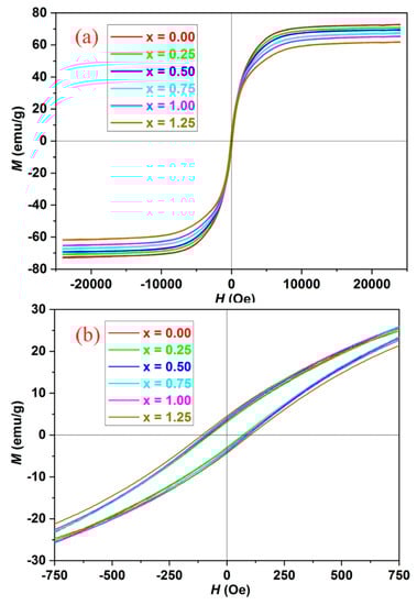 The magnetic hysteresis loops with the maximum magnetic field of ±24000 Oe, and the magnified charts of magnetic hysteresis loops within the range of ±750 Oe, for the W-type SrYb hexaferrite Sr0.85Yb0.15Zn1.5Co0.5AlxFe16−xO27 are exhibited in Figure 7a,b, respectively. From the magnetic hysteresis loops, the saturation magnetization (Ms), remanent magnetization (Mr), and coercivity (Hc) for W-type SrYb hexaferrites with the Al content (x) ranging from 0.00 to 1.25 were calculated.